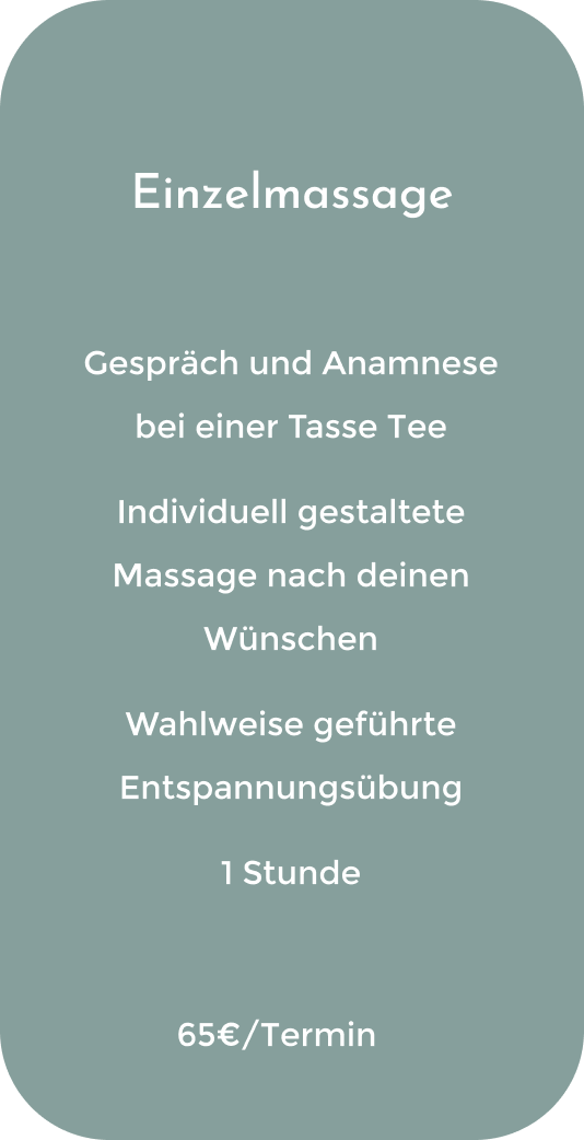 Meine Behandlungen unterstützen dein Wohlbefinden und deine Gesundheit auf körperlicher und geistiger Ebene. Da unser Gehirn und Körper in enger Wechselwirkung stehen, unterstützt physische Entspannung auch psychische Stressbewältigung. Massage führt den Körper in eine tiefe Entspannung und stellt einen Gegenpol zu unserem fordernden, aktiven Leben dar.