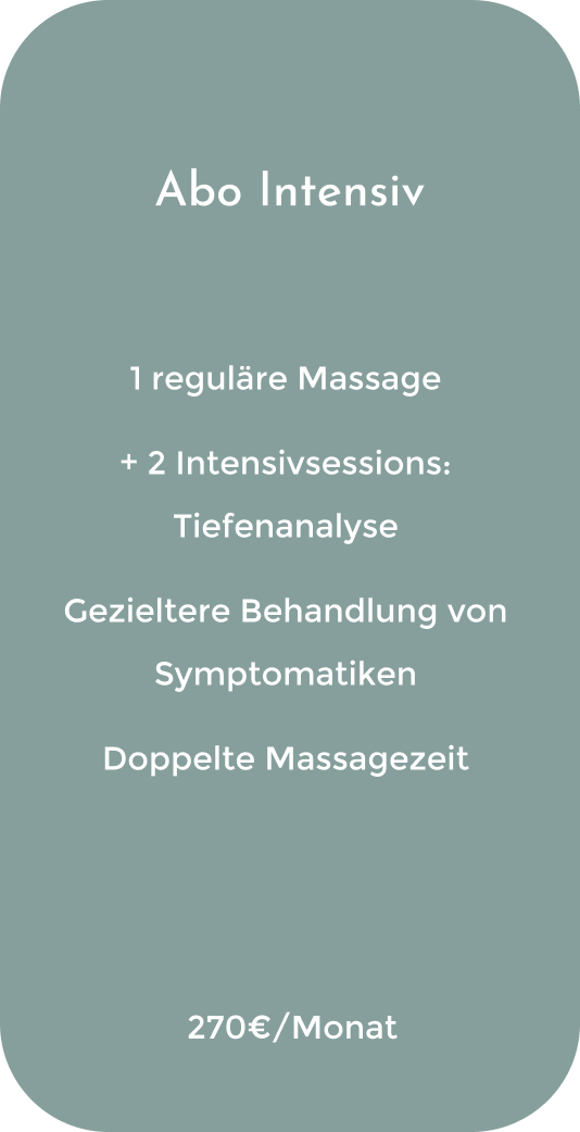 Jeder Mensch und damit jeder Körper ist anders. Wenn du keine akuten Beschwerden hast und Massage als regenerative und gesundheitsfördernde Maßnahme verwendest, schlage ich eine Session alle 2 bis 4 Wochen vor. Bei starken regionalen Verspannungen oder als Unterstützung akuter Beschwerden ist eine Therapie einmal pro Woche am effektivsten.